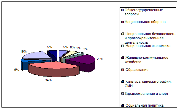 Последнее внесение изменений и дополнений в бюджет г.Пыть-Ях на 2007 год принято Решением от 25.12.2007 г. № 248, где расходы бюджета составили 2 673 515,1 тыс.руб., увеличившись по сравнению с первоначально утвержденным бюджетом на сумму 785 653 тыс.руб. или на 41,6% (в 1,4 раза). Существенное увеличение расходов произошло по разделам: 05 «Жилищно-коммунальное хозяйство» - на 415 479,7 тыс.руб. или почти в 3 раза; 07 «Образование» - на 183 937,6 тыс.руб. или на 25,7%, 09 «Здравоохранение и спорт» - на 101 511,4 тыс.руб. или на 25,1%, 10 «Социальная политика» - на 70 644,4 тыс.руб. или почти в 2 раза. Бюджет города по-прежнему имеет социальную направленность. Снижение расходов бюджета произошло только по двум разделам: 01 «Общегосударственные вопросы» - на 44 083,2 тыс.руб. или на 24,6%, 02 «Национальная оборона» - на 72 тыс.руб. или на 2,9%. Существенно изменилась структура бюджета (рисунок 4): доля раздела 05 «Жилищно-коммунальное хозяйство» стала составлять 23% расходов бюджета (увеличилась с 11% до 23%), а доля раздела 07 «Образование», несмотря на увеличение расходов по данному разделу, уменьшилась на 4 процентных пункта с 38% до 34%, аналогично снизилась доля раздела «Здравоохранение и спорт» на 2 процентных пункта и составила 19%, доля раздела 01 «Общегосударственные вопросы» составляет всего 5%.