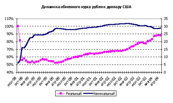 В итоге удалось за довольно короткий промежуток времени обеспечить сближение краткосрочных показателей доходности основных активов, номинированных в иностранной валюте и рублях. Это позволило Банку России сбалансировать к началу лета потоки краткосрочного капитала и существенно сократить свое участие на валютном рынке, повысив уровень его саморегулируемости. Номинальный курс рубля к доллару США по итогам девяти месяцев 2003 года вырос на 4,1%,в то время как по отношению к евро номинальный курс рубля снизился на 5,4%. По итогам девяти месяцев 2003 года реальный эффективный курс рубля по отношению к декабрю 2002 года повысился на 3,9%. Относительная стабильность номинального обменного курса рубля способствовала притоку иностранных инвестиций и техническому переоснащению производства.