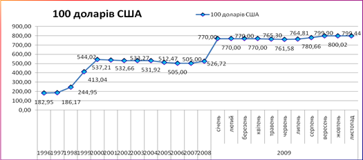 З вище наведеного графіка видно, що з роками незалежності гривня по відношенню до долара стає все дешевшою, а вартість долара, виражена у гривнях, збільшується і збільшується. Лише за 2009 рік вартість 100 доларів США збільшилась на 29,44 грн. А з 1996 року 100 доларів подорожчали на 616,49 грн або майже у 4 рази.