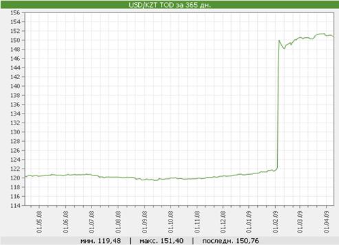С начала 2008 года по январь 2009 года снижение курса тенге к доллару составило 1%. В 2008 году официальный курс тенге "дрейфовал" в районе 120 тенге/$1. Казалось, бури и штормы мирового финансового кризиса его не касаются.