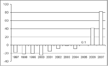 Рис. 3. Чистый (официальный) ввоз/вывоз капитала из России частным сектором, 1997–2007 гг., млрд. долл.