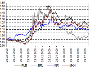 Возможно, ответ стоит искать в динамике фондовых индексов (большую часть периода имел место рост) и слухах (неофициальная информация) о планируемом притоке на развивающиеся рынки (в том числе российский) в первые месяцы наступившего года значительных средств западных фондов. Напомним, что первично аппетит к риску мировых инвесторов «подпитывался» ожиданиями позитивных корпоративных отчетов и непрекращающимися заявлениями/предположениями о том, что ставки в США в течение «длительного времени останутся на низком уровне». Отчетность в целом оказалась неплохой (лучше ожиданий), но конечный эффект оказался «смазанным». Оптимизм инвесторов начал ослабевать в связи с растущими опасениями в отношении отдельных стран Еврозоны (Греция, Испания, Португалия), что существенно усугубило положении евро на forex. На более позднем этапе рынок шокировало предложение Б.Обамы об ужесточении правил по операциям на финансовых рынках для крупнейших банков, а также инициативы Народного Банка Китая в отношении ограничения кредитования.