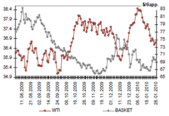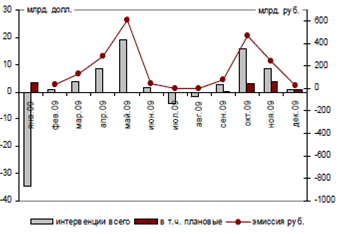 Тезис вполне обоснованно подкрепляется аргументом, суть которого состоит в том, что в определенные периоды торги на валютном рынке носят ограниченно свободный характер из-за интервенций ЦБ РФ, объем которых, кстати, в 2009 году составил, если учитывать и нетто-покупки и нетто-продажи помесячно, более $58 млрд., если опираться на итоговый показатель, то чистые покупки составили $22 млрд. При этом интенсивность вмешательства регулятора в рыночные процессы была достаточно рваной (см. рис. 6). Однако, в декабре-январе из-за умеренной активности ЦБ РФ (в обоих случаях интервенции, согласно заявлениям представителей и доступным статданным ограничивались «несколькими сотнями $ млн.) «технические» уровни по бивалютной корзине стали просматриваться более четко, в частности область 36,0. Границы актуального на данный момент коридора можно описать как 35,0 – 35,65 руб.