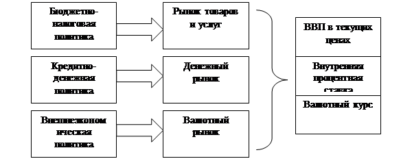 Бюджетно-налоговая политика при гибких валютных курсах может воздействовать на курс валюты в достаточно широком диапазоне. При экспансионистской бюджетной политике (росте правительственных расходов и снижении уровня налогов) происходит одновременный рост доходов населения, вследствие чего увеличиваются и расходы, и процентные ставки. Рост доходов и расходов приводит к ухудшению торгового баланса из-за увеличения импорта, а рост процентных ставок вызывает приток капитала. В зависимости от того, какой из результатов будет больше, валюта может как повыситься в цене, так и обесцениться. Таким образом, при использовании бюджетно-налоговой политики в случае с плавающим валютным курсом мы сталкиваемся с двумя противоположными тенденциями: