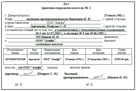 II. Акт приемки-передачи векселя от ООО «Альфа» ЧП Иванову И. И. Так как форма акта никаким нормативным документом не определена, он может составляться в произвольной форме, с указанием основания выдачи векселя (даты и номера договора, дополнительного соглашения), наименования векселедателя, номера вексельного бланка, даты выдачи векселя, даты его погашения, суммы векселя.