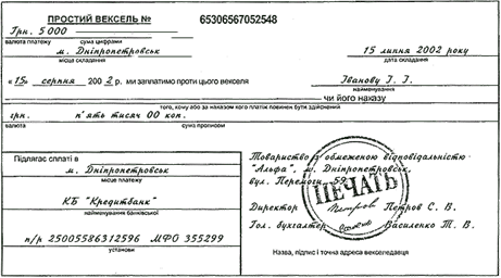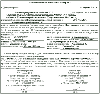 5. Наименование лица, которому или по приказу которого осуществляется платеж. Во избежание возможных проблем при взыскании задолженности по векселям частным предпринимателям необходимо обратить внимание на то, что в ст. 5 Закона № 2374 отмечается, что наименование векселедателя, других обязанных по векселю лиц, заполняются на том языке, на котором определено официальное наименование в их учредительных документах.