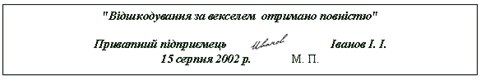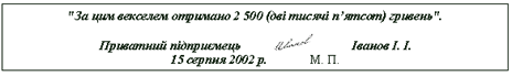 Например, при частичной оплате по векселю в сумме 2500 грн. ЧП Иванов И. И. на обратной стороне векселя должен сделать запись следующего содержания: