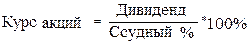 Акция имеет номинальную (цена, обозначенная на акции) и рыночную (цена, по которой реально покупается акция или курсовая) стоимость. Курс акций находится в прямой зависимости от размера получаемого по ним дивиденда и в обратной зависимости от уровня ссудного (банковского) процента (формула 1.2):