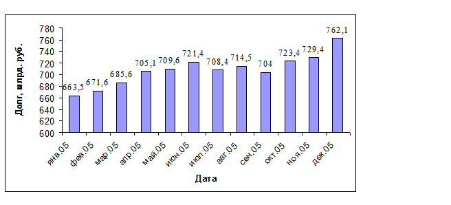 Государственный внутренний долг, выраженный в ценных бумагах, за 2005 г. вырос на 98,58 млрд. руб. - с 663,53 млрд. до 762,11 млрд. руб. (таблица. 2.1, рис.2.1).