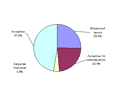 Значительная часть средств была привлечена за счет проведения аукционов (48%) и аукционов по доразмещению (23%) (рис. 2.2.). Минфин удовлетворен результатами такого способа размещения бумаг, как аукционы по доразмещению и планирует именно на аукционах и аукционах по доразмещению привлекать основной объем средств в 2006 г.
