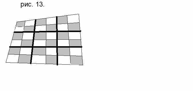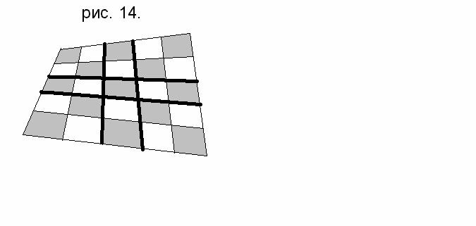 Пусть четырёхугольник разбит известными нам прямыми на n×n клеточек, где n – чётное (рис. 13).