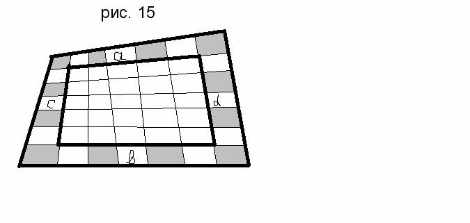 a + b + c + d = 2(c + d). Отсюда следует, что суммы площадей чёрных и белых клеток по периметру равны, а следовательно, в нашем четырёхугольнике действует предыдущее правило: сумма площадей чёрных клеток равна сумме площадей белых – не считая площади центральной клетки.