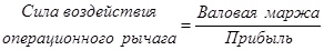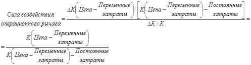Формула силы воздействия операционного рычага поможет ответить на вопрос, насколько чувствительна валовая маржа, либо нетто-результат эксплуатации инвестиций к изменению физического объема сбыта продукции. Дальнейшие последовательные преобразования этой формулы дадут способ расчета силы воздействия операционного рычага с использованием цены единицы товара, переменных затрат на единицу товара и общей суммы постоянных затрат: