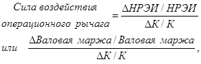Далее, если трактовать силу воздействия операционного рычага как процентное изменение валовой маржи (или, в зависимости от целей анализа - нетто-результата эксплуатации инвестиций) при данном процентном изменении физического объема продаж, то формула может быть представлена в таком виде: