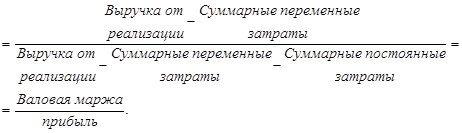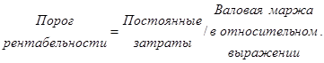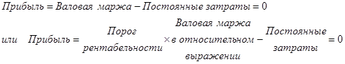 Порог рентабельности - это такая выручка от реализации, при которой предприятие уже не имеет убытков, но еще не имеет и прибылей. Валовой маржи в точности хватает на покрытие постоянных затрат, и прибыль равна нулю.