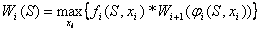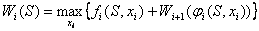6. Записать основное рекуррентное уравнение динамического программирования, выражающее условный оптимальный выигрыш Wi(S) (начиная с i-го шага и до конца) через уже известную функцию Wi+1(S):