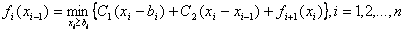 Если xi – количество работающих на протяжении i-й недели, то возможны затраты двух видов: 1) С1(xi- bi)-затраты, связанные с необходимостью содержать избыток xi - bi рабочей силы и 2) С2(xi- xi-1)-затраты, связанные с необходимостью дополнительного найма (xi- xi-1) рабочих.