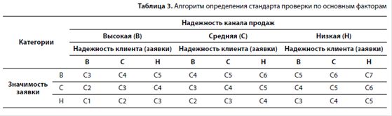 Надежность канала продаж характеризует степень уверенности банка в общей положительности клиентов, привлеченных к обслуживанию через данный канал продаж (откуда клиент попал на проверку, кто именно его направил для получения кредита). Действительно, дилеры, «поставляющие» клиентов (автосалоны, компаниипартнеры и т.п.), обычно осуществляют некоторую первичную проверку. При этом они, как правило, беспокоятся о своем имидже и продолжении взаимодействия с банком. Важно также учесть некоторые другие составляющие, например выбор клиента по критерию заведомой надежности (по «белым спискам» клиентов с положительной кредитной историей). Важным условием при определении надежности канала продаж является реализованный в кредитной организации порядок присвоения, мониторинга и пересмотра статусов надежности партнеров. Автор выделяет три степени надежности канала продаж: высокая, средняя, низкая. Критерии назначения надежности канала продаж определяет конкретная кредитная организация в своих внутренних документах. Указанные факторы (надежность клиента, значимость заявки, надежность канала продаж) в совокупности задают необходимую для конкретной заявки программу проверки по алгоритму, представленному в табл. 3.