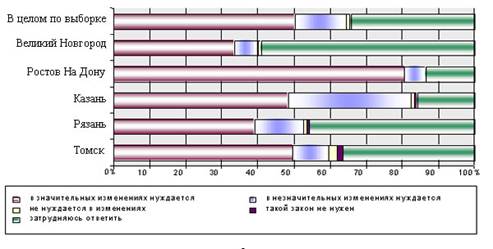 Так, около полвины (50,6%) респондентов считает, что ФЗ «О государственной поддержке малого предпринимательства в Российской Федерации» нуждается в значительных изменениях. При этом в Ростове-на-Дону такой позиции придерживаются 80% опрошенных субъектов малого предпринимательства. Наименее радикальные предприниматели в Великом Новгороде – лишь 33% предпринимателей придерживаются такой позиции (при условии, что 59,2% опрошенных затруднились ответить). В таком случае интересно отметить, что из предпринимателей хорошо знакомых с содержанием Федерального закона (их количество составило 16% от общей массы предпринимателей) 72% считает, что Закон нуждается в значительных изменениях.