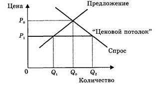 Они формируют так называемый рынок продавца, диктующего свои условия покупателям, ведут к образованию дефицита продукции на рынке (Q2 > Ql). Размер потребления на таком рынке оказывается ниже того уровня, который был бы в условиях равновесия (Ql < Q0). В таких условиях государство часто вынуждено поддерживать производства, выпускающие продукцию по низким ценам путем выделения различных дотаций, субсидий, что в конечном счете ведет к усилению разбалансированности экономики, появлению новых проблем. Практика использования политики “ценового потолка” в экономике республики, кроме указанных последствий, порождала и такие явления, как очереди, черный рынок, коррупция на государственных предприятиях.