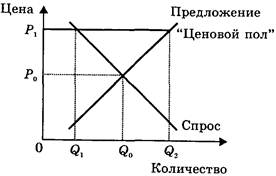На таком рынке образуются излишки продукции (Q2 > Q1), которые государство вынуждено скупать и каким-то образом затем ими распоряжаться (образовывать запасы, реализовывать на внешнем рынке и т.п.). Уровень потребления в условиях проведения политики “ценового пола” тоже оказывается ниже, чем в условиях равновесного рынка (Q1 < Q2).