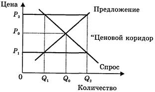 Политика “коридора цен” заключается в том, что устанавливаются два предела цен: верхний и нижний. Цены таким образом одновременно ограничены максимальным и минимальным уровнями, что не позволяет им существенно отклоняться от положения равновесной цены (рисунок 3).