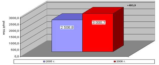 В 2006 году в федеральный бюджет поступило доходов 3 000,7 млрд. рублей, что на 493,9 млрд. рублей, или на 19,7% больше, чем за 2005 год (см. рис.1) Доходы бюджетов Российской Федерации состоят из налоговых и неналоговых доходов, а также средств целевых бюджетных фондов.