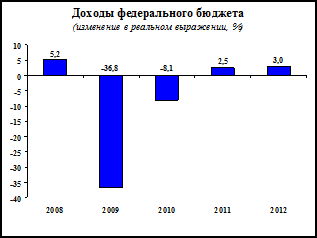 Снижение доходов федерального бюджета в реальном выражении в 2010 году составит порядка 8%, а в процентах ВВП они окажутся на 1,4 п.п. ниже. Влияние экономического кризиса на доходы федерального бюджета будет достаточно продолжительным, и даже к 2012 году доходы в реальном выражении прогнозируются на 3% ниже уровня 2009 года.