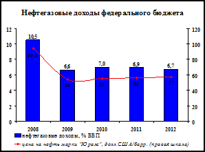 Нефтегазовые доходы федерального бюджета существенно сокращаются: в 2009 году – 6,6% ВВП против 10,5% ВВП в 2008 году. В 2010-2012 годах они сохраняются на уровне 6,8-7,0% ВВП.