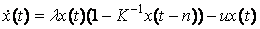 и К - положительные параметры. Уравнение (3.2) возникает при моделировании рака костного мозга (миеломы), в этом случае x(t) - количество клеток миеломы, а член ux(t) отражает предположение, что больные клетки погибают прямо пропорционально концентрации введенного лекарства и размеру опухоли. Иногда более удовлетворительного соответствия можно достичь, если использовать уравнение (3.2) с запаздыванием n > 0