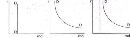 Предложение денег определяется эмиссией денег и зависит от денежно-кредитной политики Банка России. В условиях инфляции, когда требуется сокращение количества денег в обращении, кривая предложения денег может быть перпендикулярна к оси абсцисс. Если необходимо фиксировать норму ссудного процента, то кривая предложения параллельна этой оси. Если же необходимо изменить и количество денег в обращении и норму ссудного процента, то кривая предложения располагается наклонно к оси абсцисс (рис. 7).