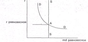 Точка пересечения кривой спроса и кривой предложения денег есть точка равновесия рынка денег. Точка равновесия определяет рыночную цену денег, которая измеряется в единицах номинальной нормы ссудного процента, а также равновесное количество денег md = ms (рис. 8).