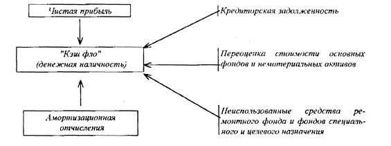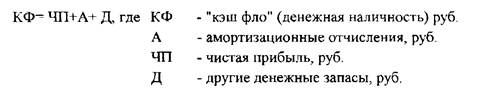 В зарубежной экономике накопление собственного денежного капитала в процессе образования денежной наличности получил название кэш-фло (от англ. cash- деньги, денежная наличность, flow - поток, течь). Показатель кэш-фло означает ту часть денежных средств, которая остается у хозяйствующего субъекта за определенный период хотя бы и временно, до дальнейшего их распределения. Она равна сумме чистой прибыли, амортизационных отчислений и других денежных запасов/неиспользованных денежных средств: