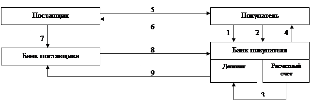 1 – заявление на получение чековой книжки; 2 – платежное поручение для депонирования средств; 3 – депонированные средства; 4 – выдача чековой книжки; 5 – отгрузка ТМЦ; 6 – выдача чека; 7 – реестр чеков для оплаты; 8 – требование на оплату; 9 – перечисление средств.