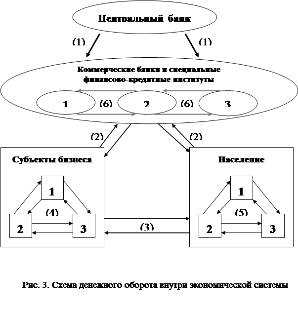 Схема денежного оборота внутри экономической системы показана на Рис.3. Овалами обозначены банковские учреждения и специализированные кредитно-финансовые институты, прямоугольниками – небанковские участники денежных операций. Стрелками показаны и соответственно пронумерованы денежные потоки, функционирующие в экономической системе. Рассмотрим эти потоки подробнее.