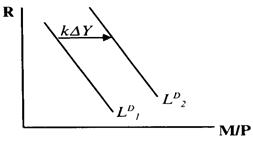 где коэффициенты k и h отражают чувствительность спроса к доходу и к ставке процента. Функция спроса на деньги показывает, что при любом данном уровне дохода величина спроса будет падать с ростом ставки процента и наоборот. Увеличение уровня дохода отразиться сдвигом кривой спроса на деньги LD вправо на величину k∆Y (см. рисунок 1.1).