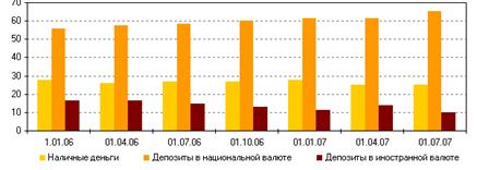 В структуре рублевой денежной массы (рис. 5) доля наличных денег в обращении на 1.07.2007 сократилась относительно 1.01.2007 на 3,1 процентного пункта (до 27,9%), удельный вес депозитов "до востребования" повысился на 2,4 процентного пункта (до 33,7%), а срочных депозитов — на 0,7 процентного пункта (до 38,5%).