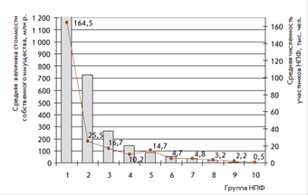 Существует непосредственная связь между стоимостью собственного имущества НПФ и численностью его участников. Нами проведено распределение НПФ по децильным группам исходя из средней величины стоимости собственного имущества, которая сопоставлена со средней численностью участников НПФ данной группы (рис. 2). Прослеживается прямая зависимость между рассматриваемыми показателями: чем большее количество участников привлечено в фонд, тем больше стоимость имущества данного НПФ: в первой группе НПФ при средней численности участников 164,5 тыс. чел. каждый фонд имеет собственного имущества в среднем на 18 450,3 млн р., тогда как в десятой группе НПФ, при средней численности участников около 0,5 тыс. чел., каждый фонд имеет собственного имущества только на сумму 1,5 млн р.