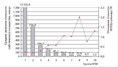 Качество работы НПФ во многом зависит от рациональности управления собственными ресурсами. НПФ — лидеры, относящиеся к первым пяти группам, а также близкие к ним по величине рассматриваемого показателя НПФ девятой группы демонстрируют эффективное управление собственным имуществом: они в основном стараются разместить поступившие финансовые ресурсы в пенсионные резервы с тем, чтобы направлять их на инвестиционные цели, а не использовать на осуществление текущей деятельности фонда. Для НПФ данных шести групп характерно превышение размера ПР над стоимостью ИОУД, чаще всего в 2 раза, тогда как НПФ, входящие в шестую—восьмую и десятую группы, имеют превышение стоимости ИОУД над размером ПР, и в НПФ восьмой группы данный показатель достигает 2,01. Превышение стоимости ИОУД над размером ПР свидетельствует о нерациональной финансовой политике НПФ, которые либо недавно появились в системе негосударственного пенсионного обеспечения и до сих пор в ней не освоились, либо проводят излишне осторожную инвестиционную политику. В восьмой, наименее экономически эффективной, группе велика доля региональных НПФ, большинство из которых еще не производили пенсионные выплаты застрахованным в них лицам. Стоимость собственного имущества в данной группе варьирует в интервале 11,4-31,7 млн р., и большая часть его не направляется НПФ в пенсионные резервы, а остается в их текущем управлении.