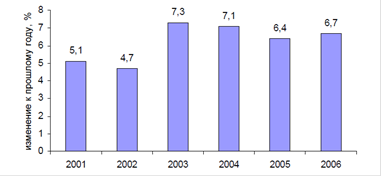 Динамика прироста ВВП наглядно представлена на рисунке 4. В последние 3 года наблюдается довольно стабильный прирост ВВП; так, согласно рисунку 4, за 2003 и 2004 гг. прирост составил свыше 7%, что свидетельствует о сохранении общего экономического роста. Но также стоит отметить, что в 2005 и 2006 гг. темп прироста составил ниже 7%. На снижении динамики сказалось влияние ряда негативных факторов (ускорение инфляции, издержек, замедление темпов прироста экспорта, торможение роста инвестиций и потребления, давление конкурирующего импорта). Однако этот показатель выше по сравнению с ведущими экономически развитыми странами мира [17, с. 25].