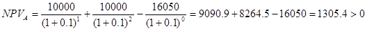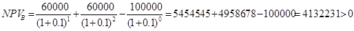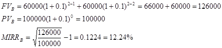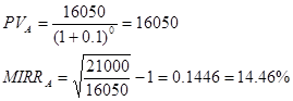 Вывод: Для обоих проектов значение MIRR больше альтернативных возможностей рынка капитала на 4,4% (14.46% - 10%) и на 2,25% (12,24 - 10%), но т.к. должен быть только один проект, то выбираем проект А, который имеет наибольшую доходность.