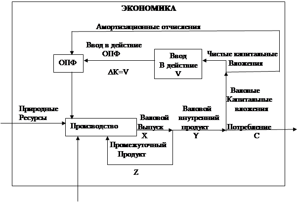 В результате функционирования экономики за год все отрасли материального производства (промышленность, сельское хозяйство, строительство, транспорт и т.п.) создают валовой внутренний продукт (ВВП). В натурально-вещественной форме ВВП распадается на средства труда и предметы потребления, в стоимостной форме - на фонд возмещения выбытия основных фондов (амортизационный фонд) и вновь созданную стоимость (национальный доход).