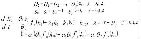 Используя основные предположения Солоу, получаем следующую трехсекторную модель (индекс t опущен, но предполагается по умолчанию, ресурсы используются полностью):