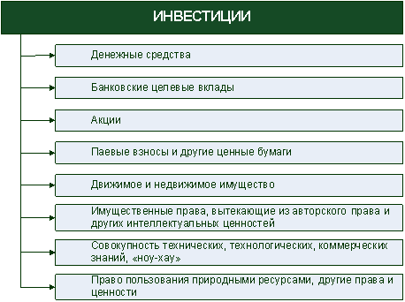 - интеллектуальные – вложения средств в творческий потенциал общества, объекты интеллектуальной собственности, вытекающие из авторского, изобретательского и патентного права.
