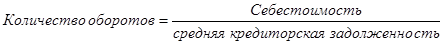 Данный коэффициент должен быть основан на соотнесении данных о закупках и кредиторской задолженности. Поскольку информация о закупах в отчётности отсутствует, в целях упрощения расчётов при проведении внешнего анализа, в частности анализа кредитоспособности, может быть использована величина себестоимости проданной продукции. Данный показатель отражается в бухгалтерской отчётности, что облегчит внешнему пользователю проведения расчётов.