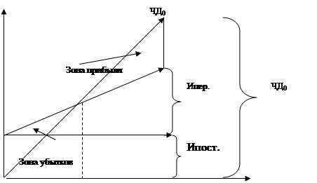 Графически "точка безубыточности" (или "порог рентабельности") операционной деятельности предприятия в коротком периоде, в течение которого не меняются уровень цен на продукцию, уровень переменных издержек и сумма постоянных издержек, представлена на рис.2.