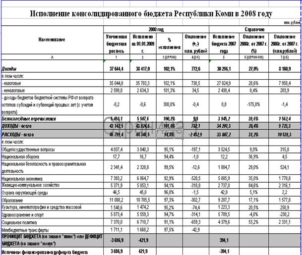 По доходамконсолидированный бюджет Республики Коми исполнен в сумме 43 млрд. 925 млн. рублей, что на 1,8% превышает уточненный годовой план.В сравнении с 2007 годом фактический уровень доходов 2008 года возрос на 9 млрд. 723 млн. рублей (или на 28,4%)