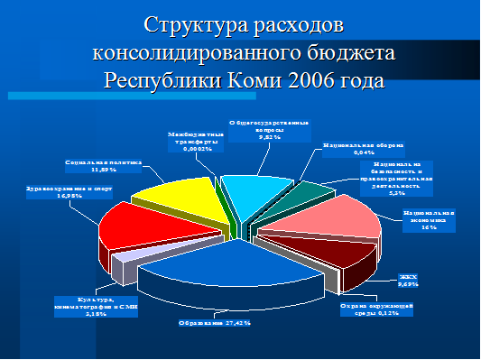 Анализируя структуру расходов консолидированного бюджета Республики Коми 2006 года, хотелось бы обратить внимание на сохранение их социальной направленности (рис. 11). Так, по итогам 2006 года на финансирование отраслей социальной сферы приходится около 59% всех расходов, что составляет 17 млрд. 479 млн. рублей, в том числе на образование (27,4 общей суммы расходов), на здравоохранение и физическую культуру (17%), социальную политику (11,9%), культуру, кинематографию и средства массовой информации (3,2%).