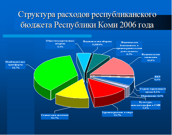 Анализ расходов республиканского бюджета Республики Коми показал, что наибольший удельный вес приходится на межбюджетные трансферты, которые в 2006 году составили 36,7% от общей суммы расходов (рис. 12). Вторыми по объему финансирования являются расходы социальной сферы, в том числе на образование (6,4% общей суммы расходов), на здравоохранение и физическую культуру (13,7%), социальную политику (12,7%), культуру, кинематографию и средства массовой информации (1,5%).