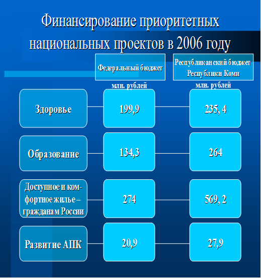 Одной из основных в 2006 году была задача реализации национальных проектов в области здравоохранения, образования, доступного и комфортного жилья гражданам России и развития АПК. На их осуществление из федерального бюджета получено 629,1 млн. руб. расходы республиканского бюджета Республики Коми составили 1 млрд. 97 млн. руб. (рис. 13).